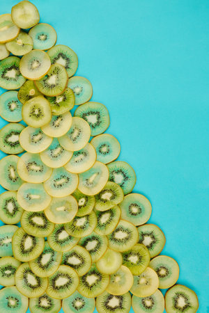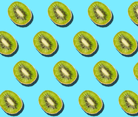 Graphic top view pattern of fresh kiwi fruit in diagonal lines on contrasted blue background, healthy eating and vegan concept, copy space
