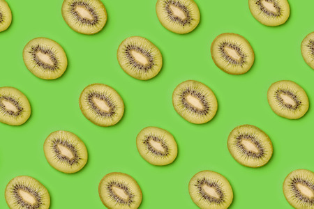 Kiwi slices pattern on green background. Food background. Fruit pattern. Pop art design, creative summer concept.