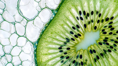 A close up of a kiwi fruit with the seeds visible. The image has a bright and lively mood, with the green color of the fruit and the seeds creating a sense of freshness