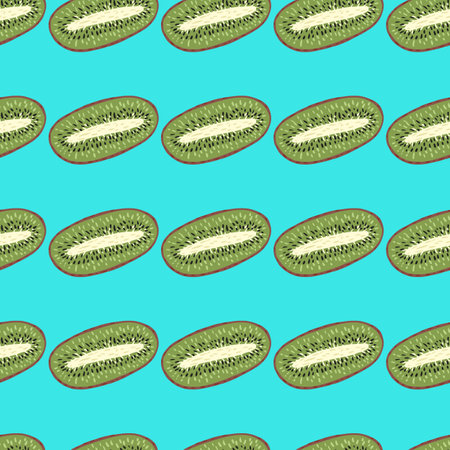 Colorful fruit seamless pattern of kiwi halves on blue background. Top view
