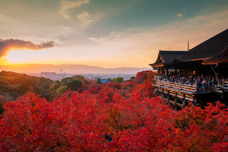 People at iconic Kiyomizu dera temple to view red maple autumn leaf and sunset, Kyoto, Japan. Famous travel destination for tourist sightseeing Kansai in fall season.