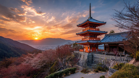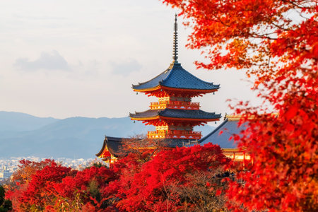 Kiyomizu dera pagoda with maple autumn leaf color at sunset, Kyoto, Japan. Famous temple vibrant red and orange pagoda with colorful fall colors enhancing scenic beauty.