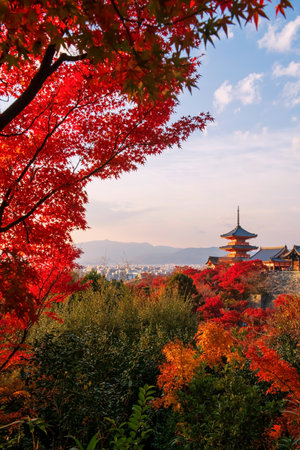 Kiyomizu-dera temple and city view with maple autumn foliage colors in vertical view, Kyoto, Japan. temple vibrant red and orange pagoda stands out against blue sky with colorful fall leaf.
