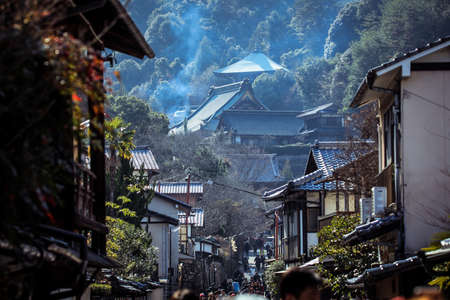 Itsukushima, Japan - January 09, 2020: Nice City Scape view to the Itsukushima Streets on the Miyajima island