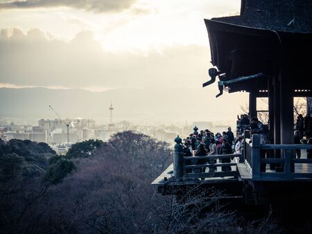 KYOTO, JAPAN - April 3, 2023: Kiyomizu-dera temple terrace view point with tourist in the afternoon