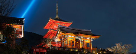 Panoramic view of beautiful illuminated Kiyomizu-dera temple meaning Pure water temple, at waterfalls in wooden hills of east of Kyoto, Japan