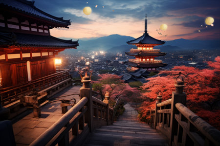 A low angle view of a pagoda in Japan at night, generated by AI