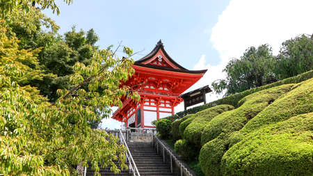 Vermilion gatehouse at Kiyomizu dera Temple with flag in Kyoto