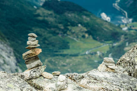 Stack of rocks with mountain and fjord view, on Pulpit Rock / Preikestolen, Norway