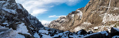 Beautiful winter mountain panorama in Norway, on the way toTrolltunga. Amazing blue lake between high rocks under snow.