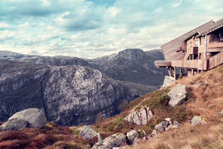 Small building from stones on the cliff with scenic view at Norwegian national park.