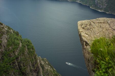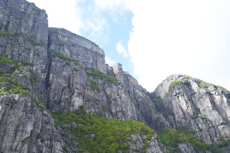 Preikestolen pulpit rock made of granite seen from below from the bottom of Lysefjord fjord and canyon in Norway