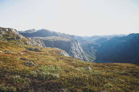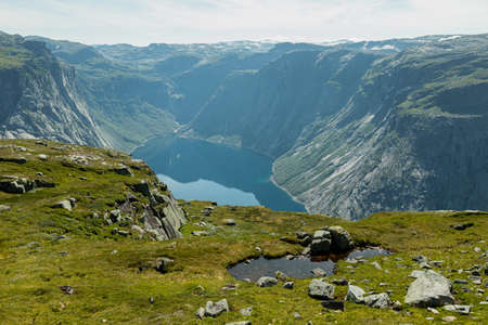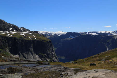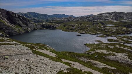 Hiking in Hordaland, Norway. Views along the trail to Trolltunga. Summer adventure.