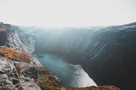 Lake in the mountains in foggy morning, Norway. Ringedalsvatnet lake on the hiking trek to Trolltunga