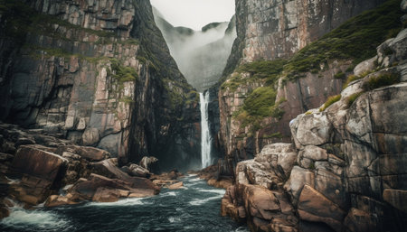 Majestic mountain range, tranquil ravine, flowing water generated by artificial intelligence