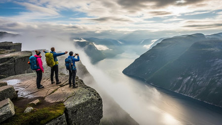 Three hikers stand on a cliff edge, taking in the majestic fjord and mountain landscape under a dramatic sky.