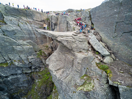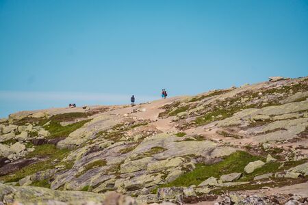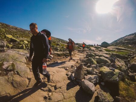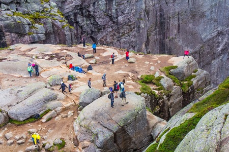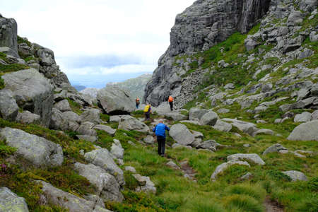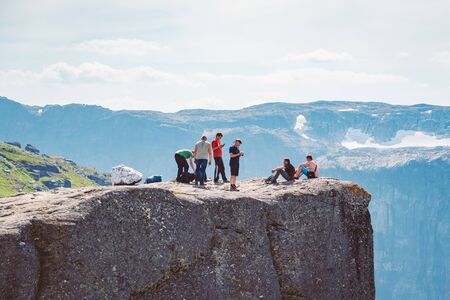 July 26, 2019. Norway tourist route on the trolltunga. People tourists go hiking in the mountains of Norway in fine sunny weather to thetrolltunga. Hiking backpack theme.