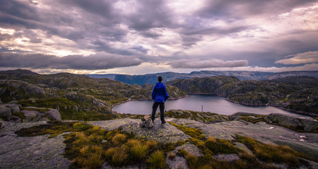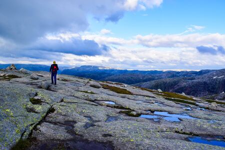 Norway- July 31, 2018: Traveler in the landscape near the Kjerag rock, Norway