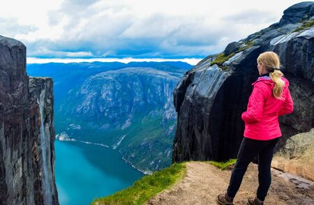 Tourist girl stands on the edge of a cliff 984 meters high above Lysefjorden, where famous Kjeragbolten stuck nearby - the most dangerous stone in the world. Mountain Kjerag, Rogaland county, Norway.
