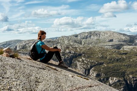 Sporty woman on the top of fjord near Kjeragbolten, Norway. Relax, success, motivation concept