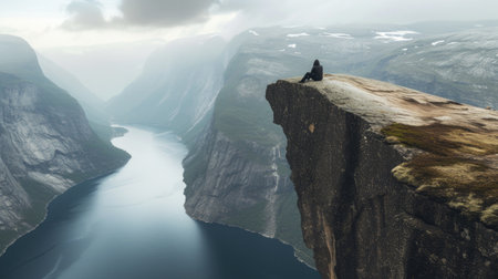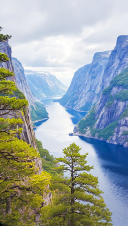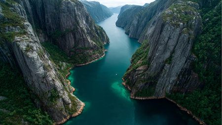Majestic fjord landscape with towering cliffs, lush green trees, and a deep blue river winding through the valley. Concept of wild tourism, travel, scenic beauty, wilderness exploration, and adventure