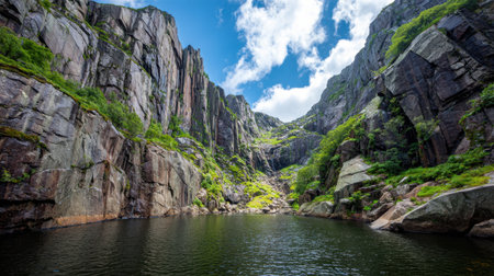 Experience the breathtaking beauty of nature with rocky cliffs rising majestically over a calm body of water, surrounded by lush greenery and a vibrant sky.