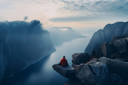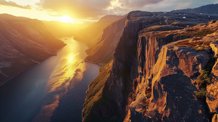 Generative AI conic fjord landscapes, drone's perspective, golden hour tones, rugged cliffs, photorealistic sunset over Norwegian fjords