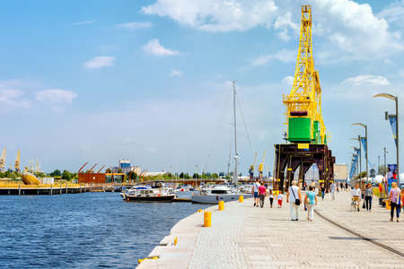 Stettin, Poland, June 2018 People walking and relaxing in Old Town quay and promenade. Rustic dock cranes, Dzwigozaury, in background