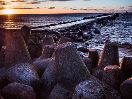Photo of an artificial stone breakwater in the port at the sea gate in Baltic sea, Klaipeda