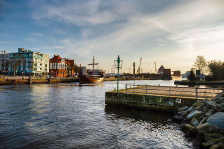 Docks on the Martwa Wisla in Poland city of Gdańsk with docked cargo ship under repair and port cranes in background during cloudy autumn morning