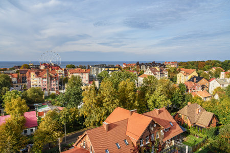 Aerial view city Zelenogradsk from observation deck of Water Tower at autumn. Russia