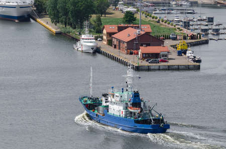 August 16, 2017: Klaipeda, Lithuania.Boats and cranes in the port of Klaipeda.