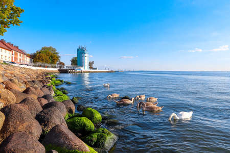 The pilot tower on the pier of Baltiysk. Swans swim in the Baltic Sea