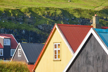 Traditional feroe islands village with colored rooftops and green hills