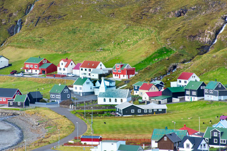 Stongum, Faroe Islands - 30 April 2018: View of the Stongum on Vagar island. A small village situated on the slope of a hill.