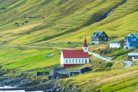 View of the Sandavagur with Sandavags church on Vagar island. A small village situated on the slope of a hill. Faroe Islands.