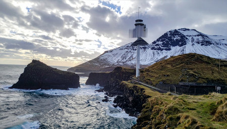 A modern lighthouse stands as a solitary sentinel on the rugged, windswept coast of the Faroe Islands. Below, powerful North Atlantic waves crash against ancient rocks, while snow-dusted mountains rise majestically under a dramatic, cloudy sky, evoking a sense of adventure and remote beauty.