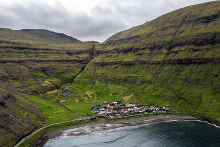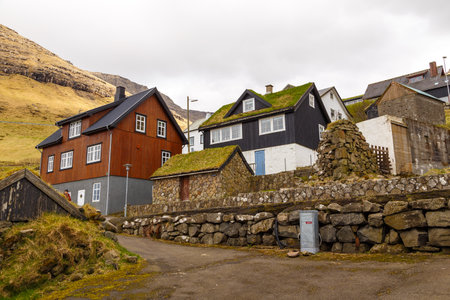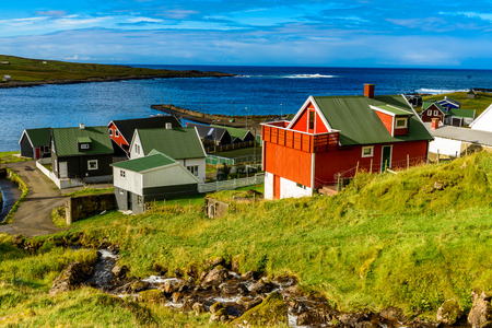 Bour, Faroe Islands - 30 April 2018: View of the Bour on Vagar island. A small village situated on the slope of a hill.