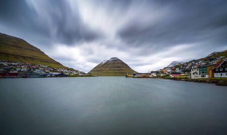 Dramatic scene of pittoresque scandinavian village located in Faroe Islands. Remote settlement surrounded with snow covered mountains and deep narrow fjords in Faroe Islands.