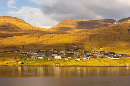 Sandavagur, Faroe Islands - 29 April 2018: View of the village on Vagar island. A small village situated on the slope of a hill. Faroe Island