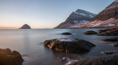 Faroe Islands Kalsoy in sunset light durig twilight with pink sky and cliffs.