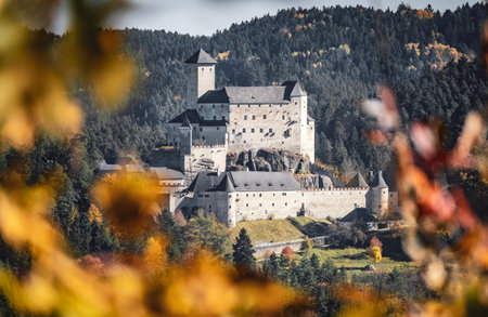 Castle in the autumn forest. Fairytale castle in the mountains.