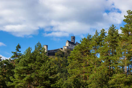 Panoramic view of Bezdez castle in the Czech Republic. In the foreground there are trees, in the background is a hill with castle and there are a white clouds in the blue sky.