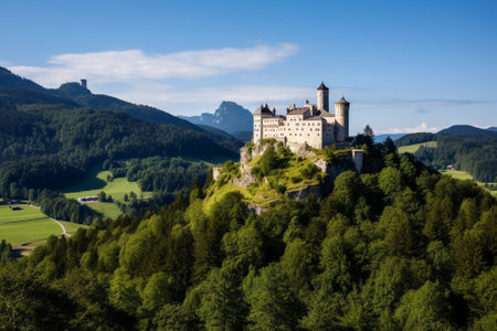 medieval castle perched on a hill, surrounded by a dense forest, with a winding river below. Generative AI