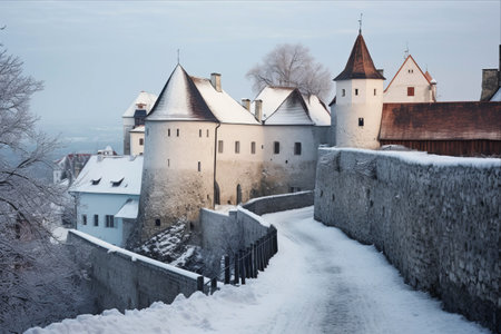 The cobblestone road leads to a grand castle its imposing walls and turrets towering over the ancient roadway below. . AI generation