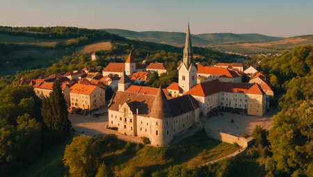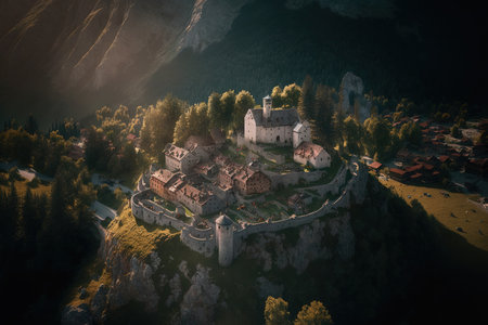 An aerial shot capturing a majestic castle perched on a hilltop surrounded by vibrant autumn foliage, the picturesque scene evokes a sense of wonder and timelessness.
