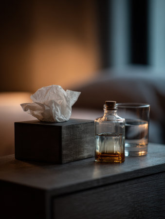 A nightstand holds a small medicine bottle, a glass of water, and crumpled tissues, illuminated softly against a backdrop evoking calmness and simplicity.