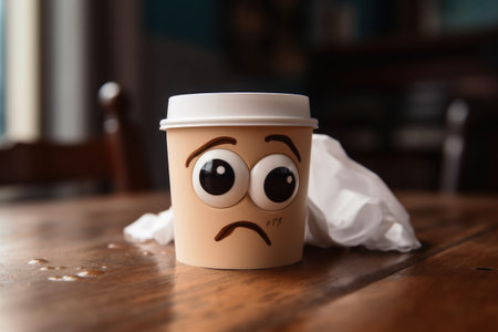 A tired coffee cup with eyes on a kitchen table created with generative AI technology