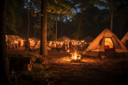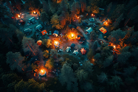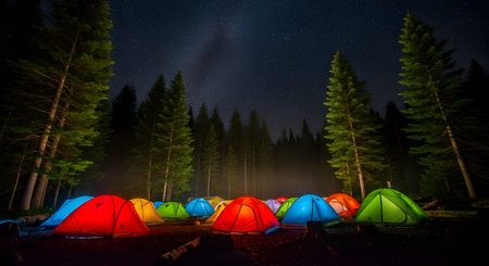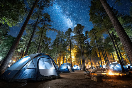 Tents and campfires light up a bustling campsite nestled in a dense forest, creating a warm atmosphere during a clear night under the stars.