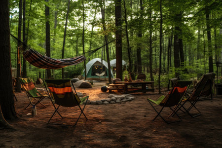 campsite setup with chairs and a hammock in the forest, created with generative ai